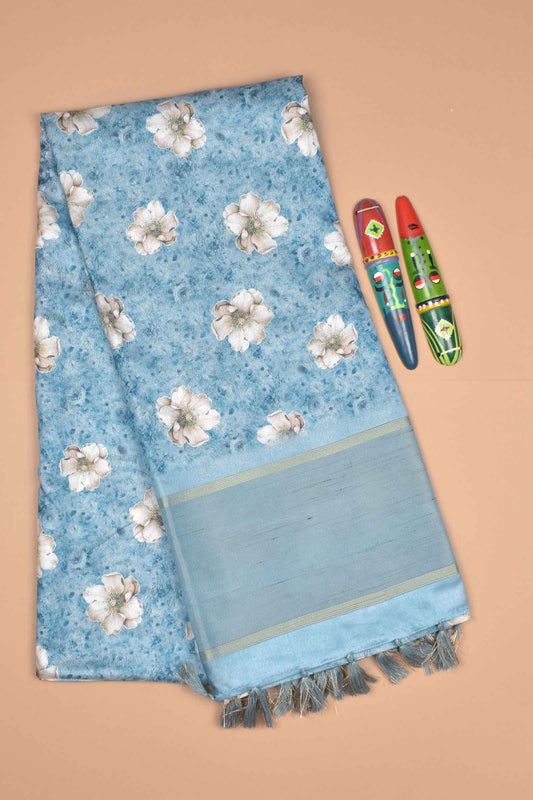 Blue-Grey Semi Linen Silver Garden Print Saree