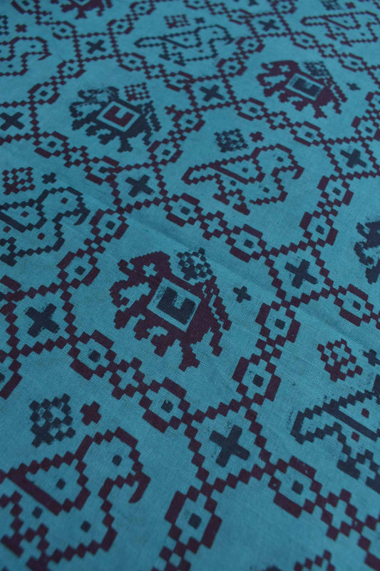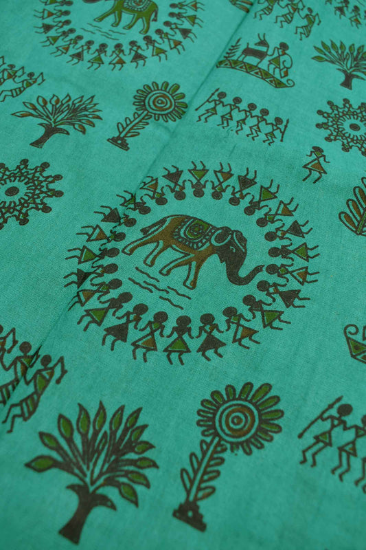 Green Blue Pure Sungudi Cotton Warli Style Floral Border Leaf Pallu Saree