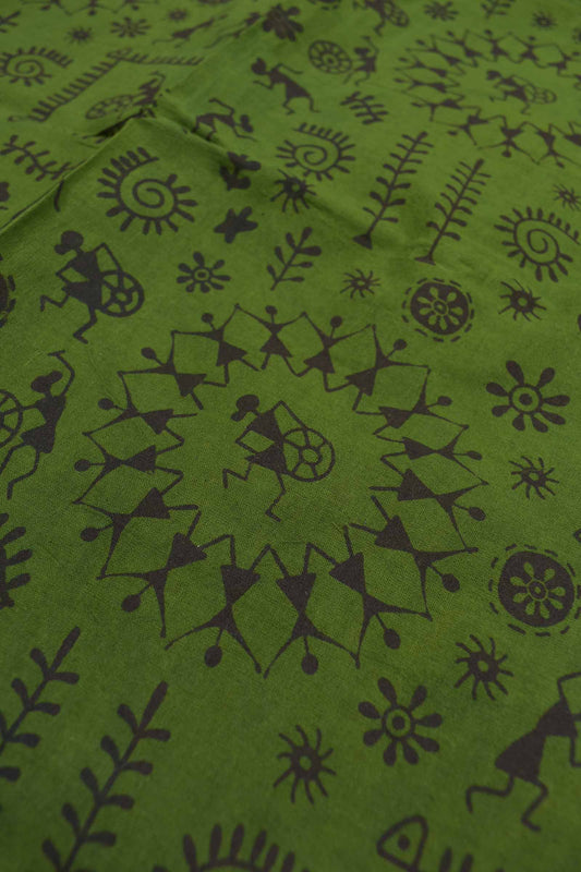 Dark Olive Green Pure Sungudi Cotton Warli Print Contrast Border Pallu Saree