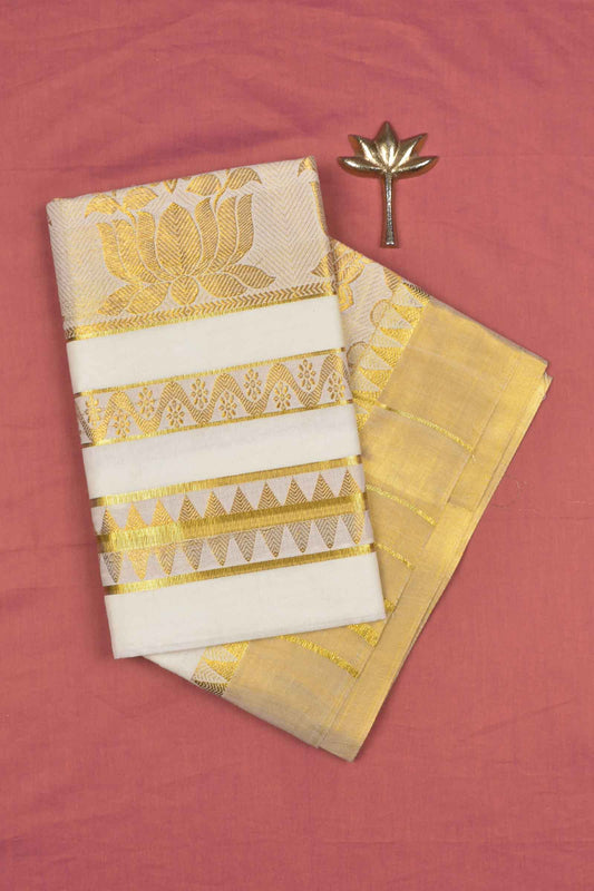 Off White Pure Kerala Cotton Line Butta Grand Golden Lotus Pallu Temple Zari Border Saree