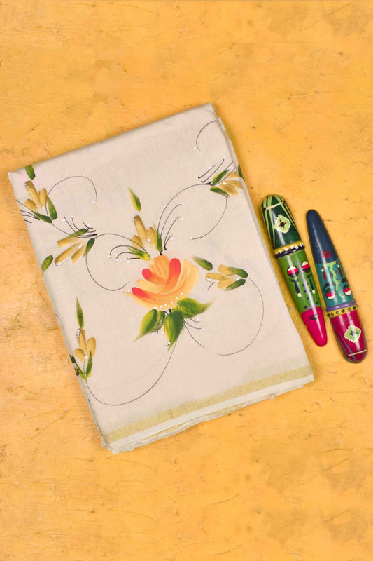 Off White Chanderi Cotton Dreamy Florals Hand Painted Saree