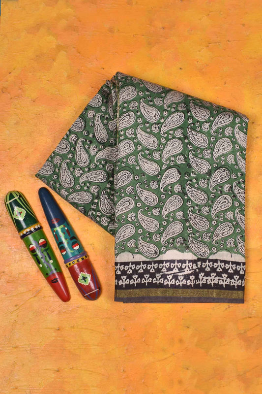 Green Chanderi Cotton Paisely Hand Block Printed Saree
