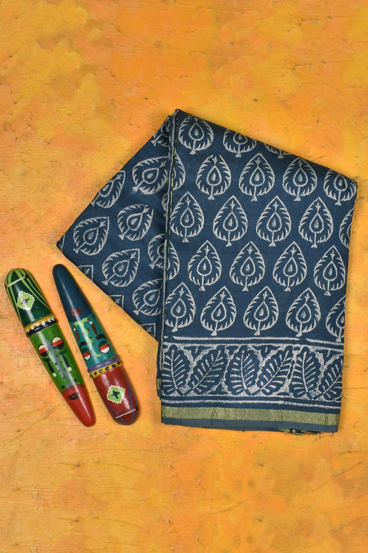 Steel Blue Chanderi Cotton Hand Block Printed Saree