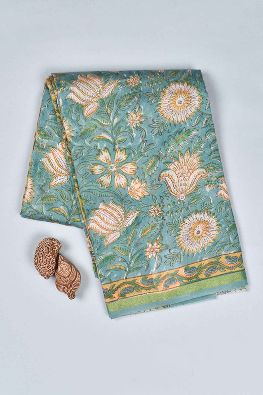 Green And Grey Pure Soft Cotton Vanaspati Handblock Print Saree