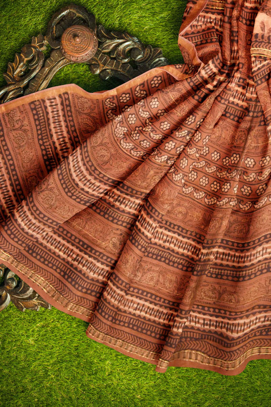 Light Brown Chanderi Ajrakh Print Saree