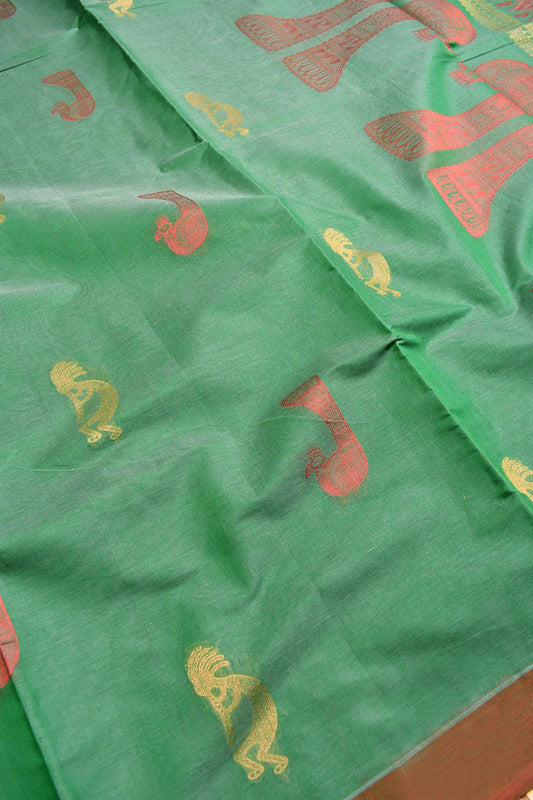 Green Pure South Cotton Dancing Figure Bird Pallu Saree