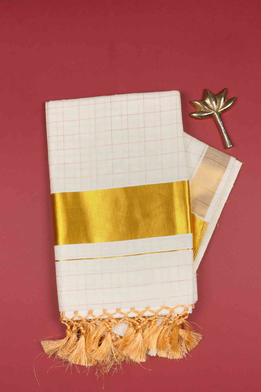 Off White Kerala Pure Cotton Checks Body and Pallu Saree