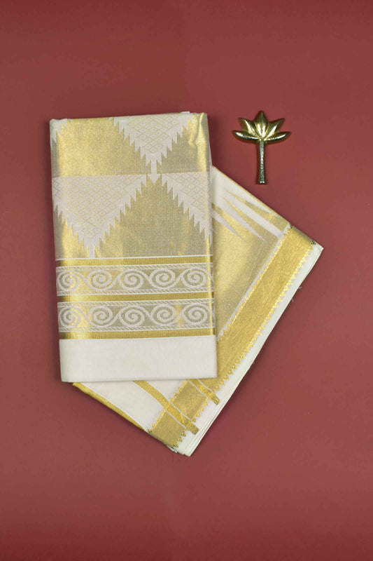 Off White Pure Kerala Cotton Mini Butta Self Royal Arches Pallu Temple Border Saree