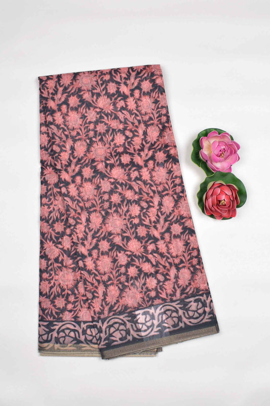 Peach-Black Semi Chanderi Cotton Fire Floral Print Saree