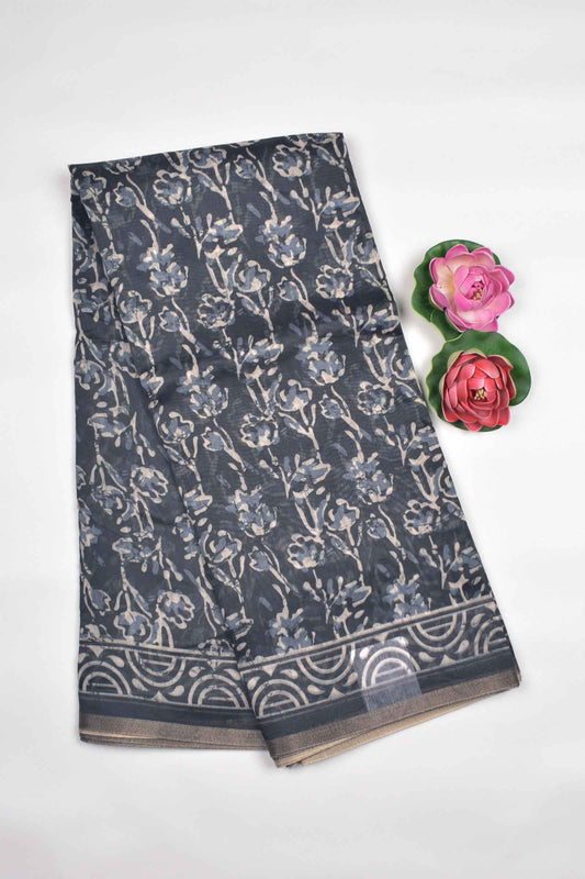 Black Semi Chanderi Cotton Floral Bulbs Print Saree NAA113