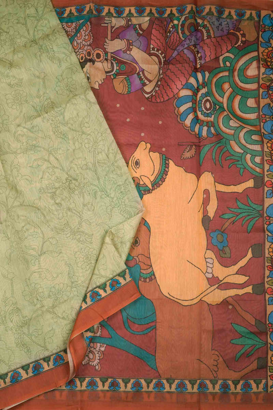 Light Green Semi Chanderi Cotton Vrindhavan Print Pallu Saree