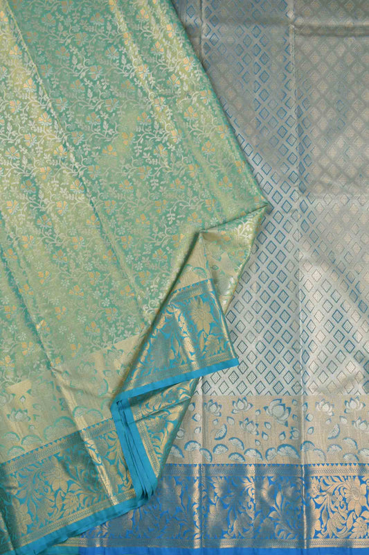 Golden Light Green Semi Silk All Over Florals Golden Blue Border Saree