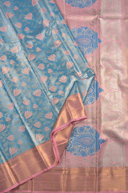 Golden Light Blue Semi Silk Fresh Lilies Golden Pink Zari Border Mango Pallu Saree