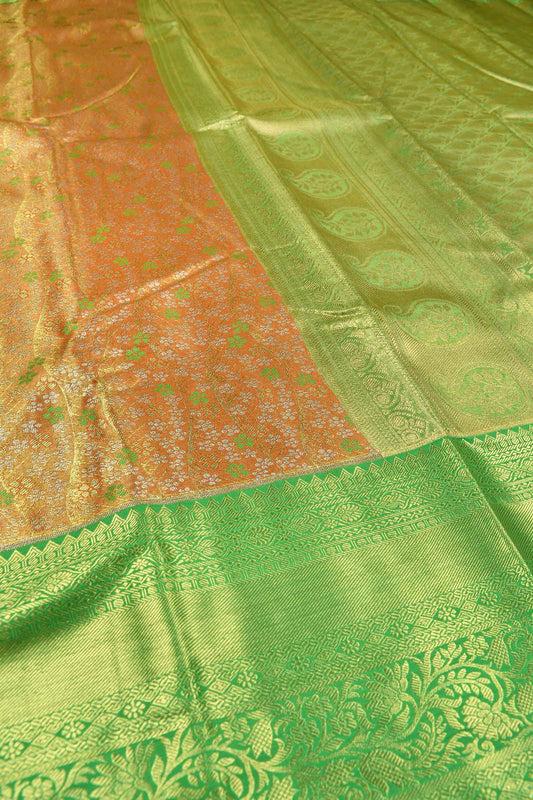 Orange Semi Silk Green Flowers Contrast Green Border Bridal Tissue Saree