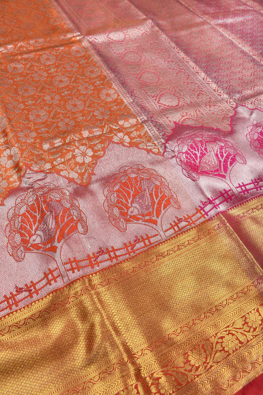 Light Orange Semi Silk Fancy Florals Contrast Pink Border Bridal Tissue Saree