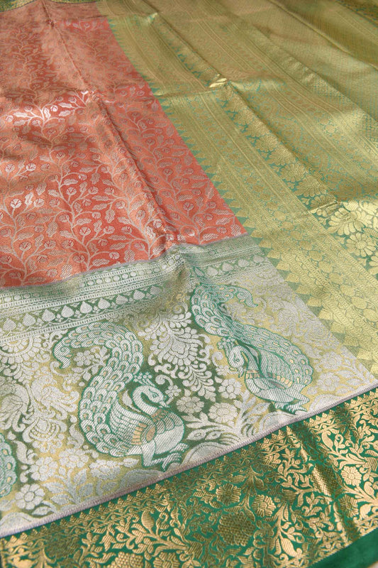 Dark Orange Semi Silk All Over Leaf Design Contrast Peacock Border Bridal Tissue Saree