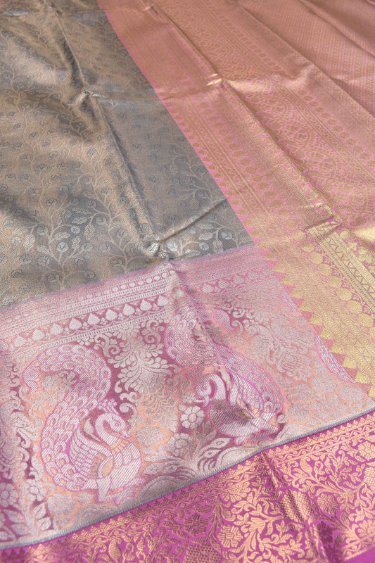 Grey Semi Silk All Over Intricate Design Contrast Pink Peacock Border Bridal Tissue Saree
