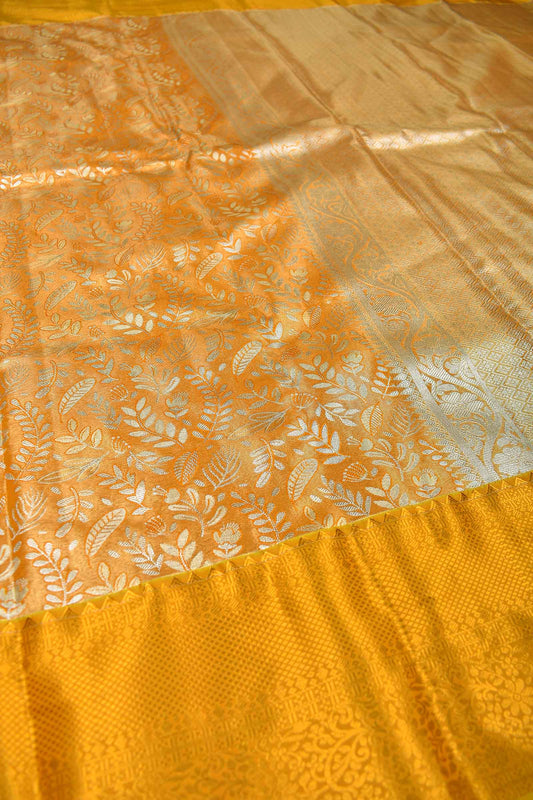 Golden Yellow Semi Silk Tissue Leaves Brocade Gold Border Saree