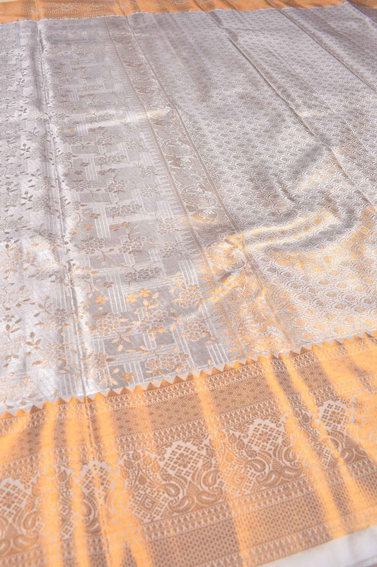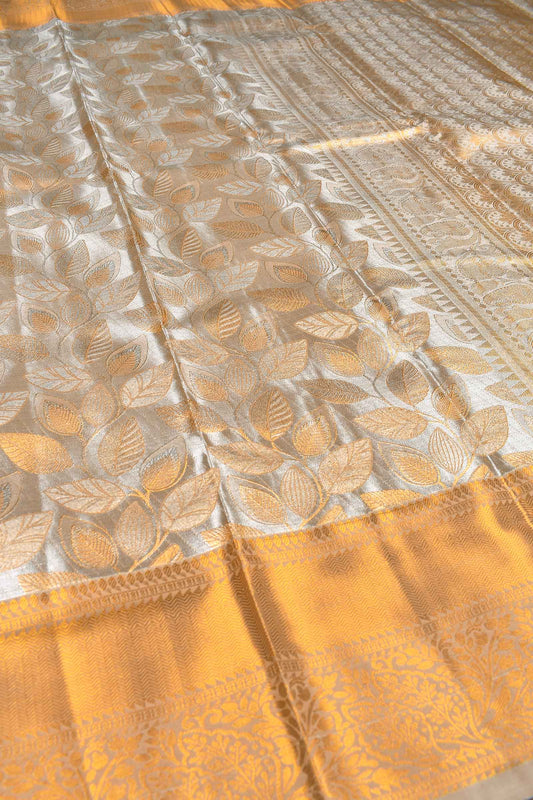 Silver Grey Semi Silk Tissue Golden Leaves Brocase Zari Border Saree