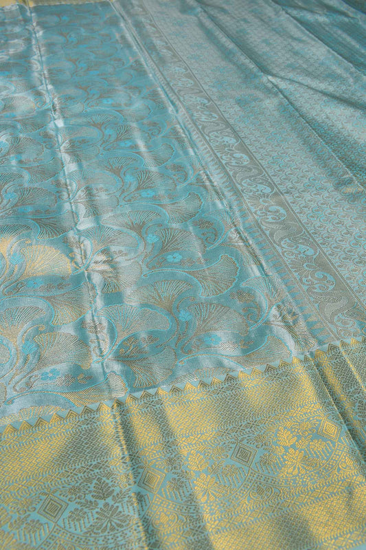Turquoise Blue Semi Silk Tissue Floral Waves Brocade Saree