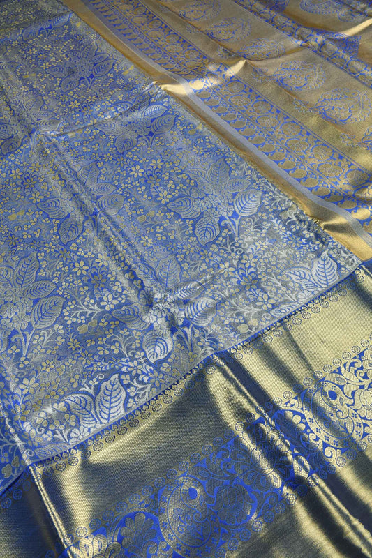 Blue Semi Silk Grand Floral Leaf Jacquard Big Border Bridal Tissue Saree