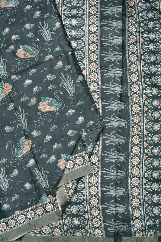 Dark Grey Semi Tussar Swan on the Lake Digital Print Saree