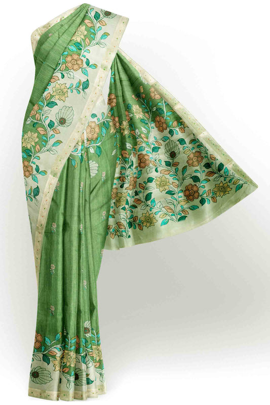 Green Printed Rangoli Print Floral Border Saree