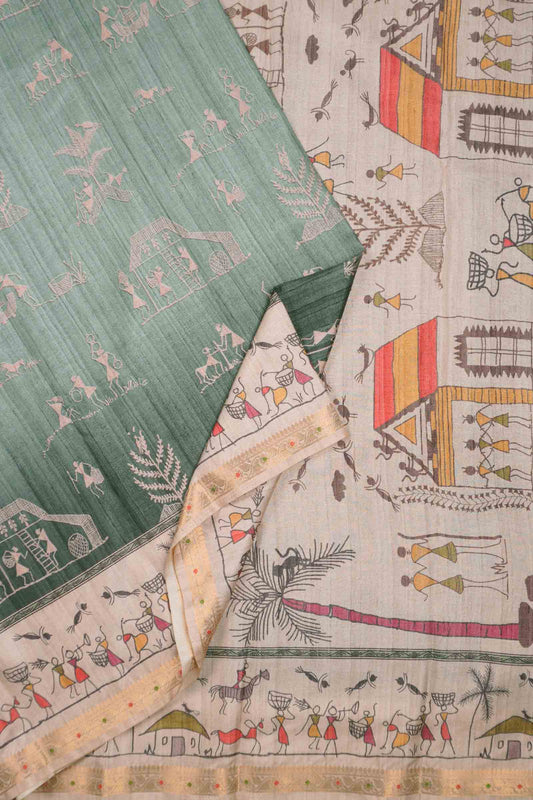 Green Ash Warli Village Print Border Saree