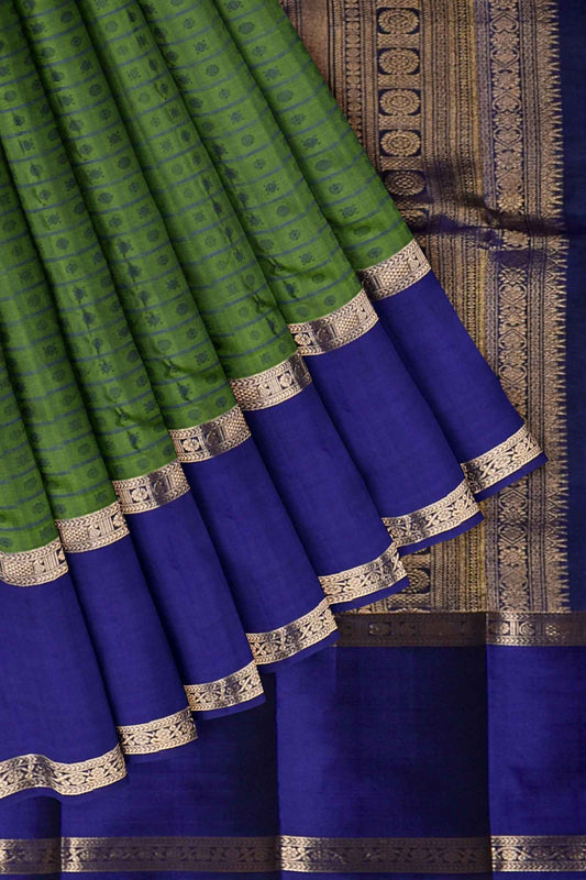 Green Kanchipuram Bridal Pure Silk Triple Flower Butta Body Blue Contrast Pallu Saree