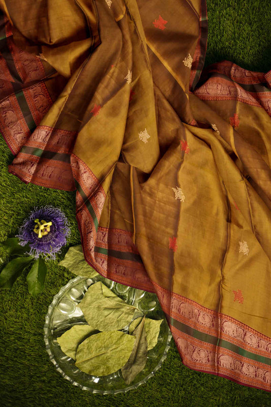 Goldish Green Kanjivaram Pure Silk Elephant Border Traditonal Pallu Saree