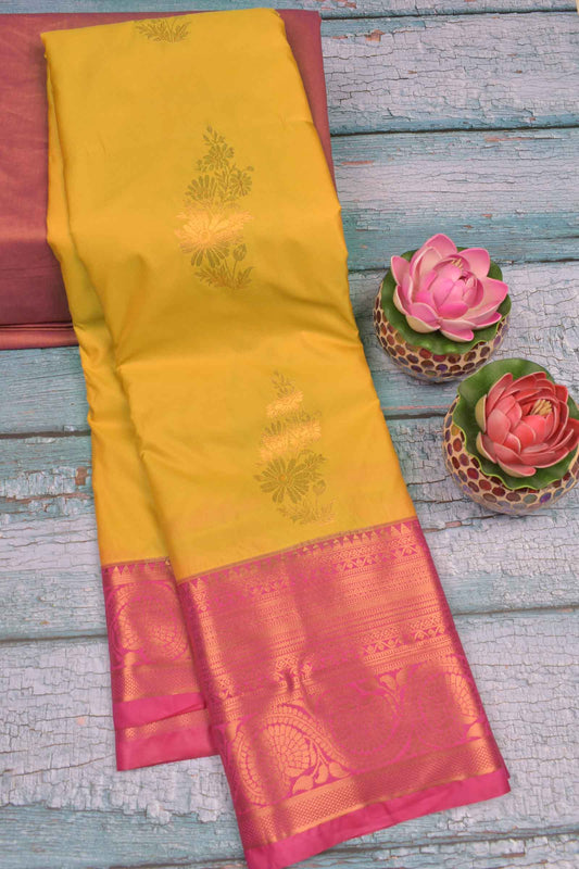 Golden Yellow Kanchipuram Bridal Pure Silk Floral Flowers Body Contrast Zari Border Pallu Saree NAA220