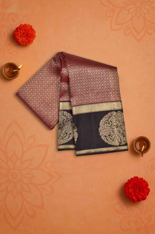 Golden Maroon Kanchipuram Bridal Pure Silk Floral Intricate Jacquard Golden Zari Border Pallu Saree NAA171