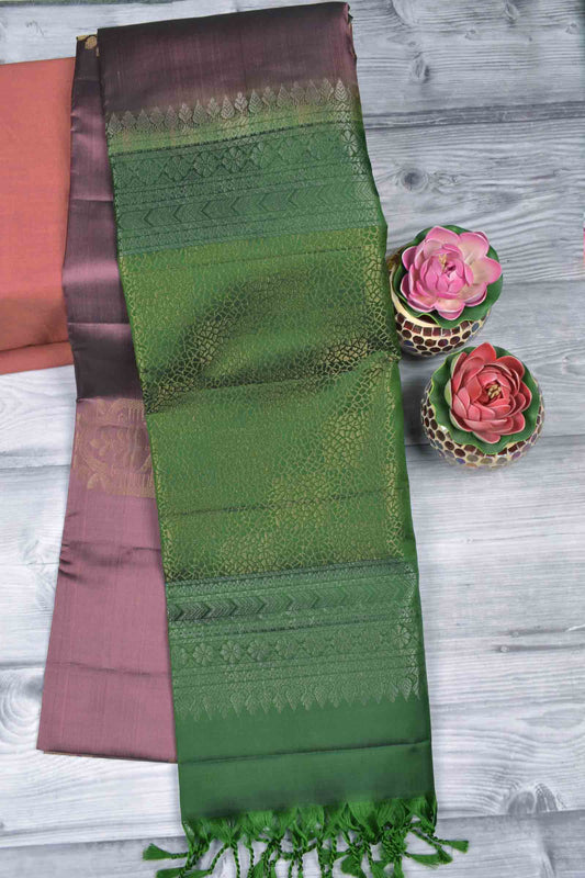 Golden Light Voilet With Sandal Semi Silk Cross Stripes Green Zari Border Pallu Saree