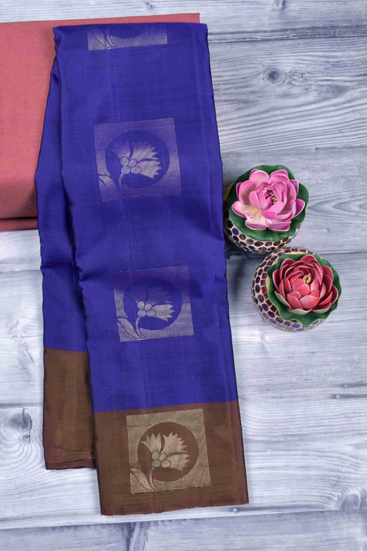 Golden Navy Blue Body Fancy Frames Butta Brown Border Pallu Semi Soft Silk Saree