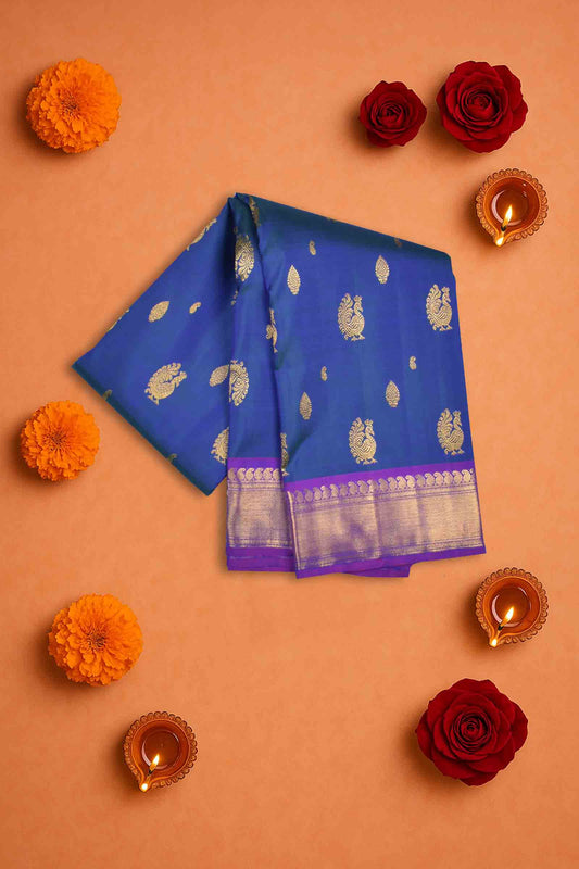 Golden Blue Light Weight Pure Silk Peacock Butta Golden Border Pallu Saree NAA104