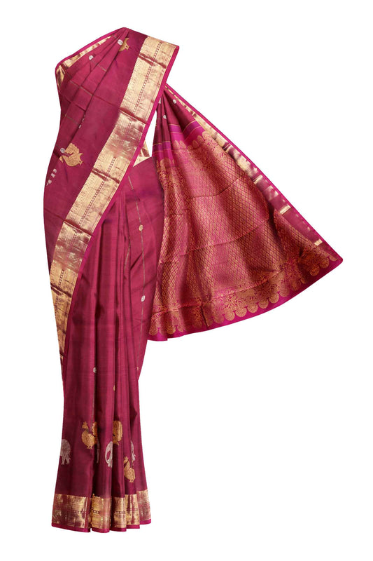 Dark Pink Light Weight Pure Silk Traditional Elephant Peacock Butta Saree