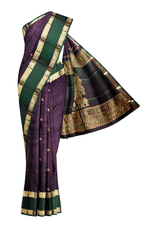 Dark Violet Pure Silk Light Weight Contrast Green Double Border Elephant Pallu Saree