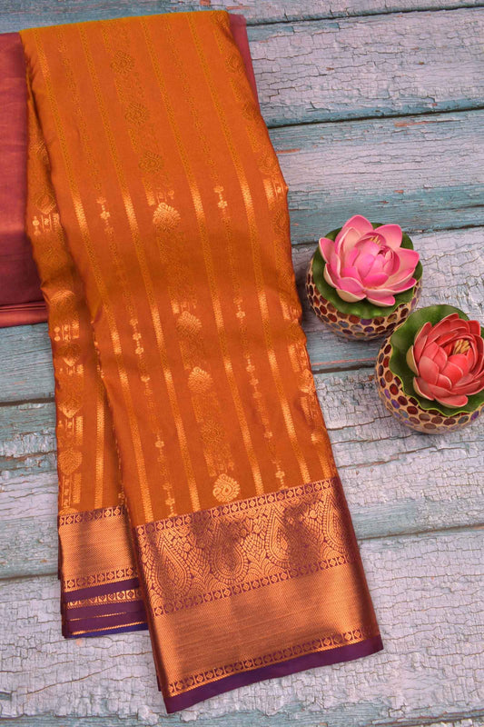 Deep Yellow Semi Soft Silk Jari Traditional Lines Contrast Violet Border Saree