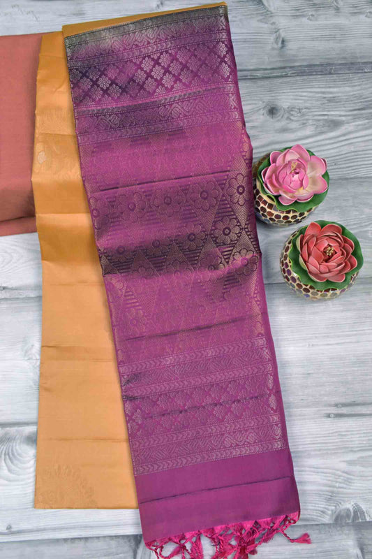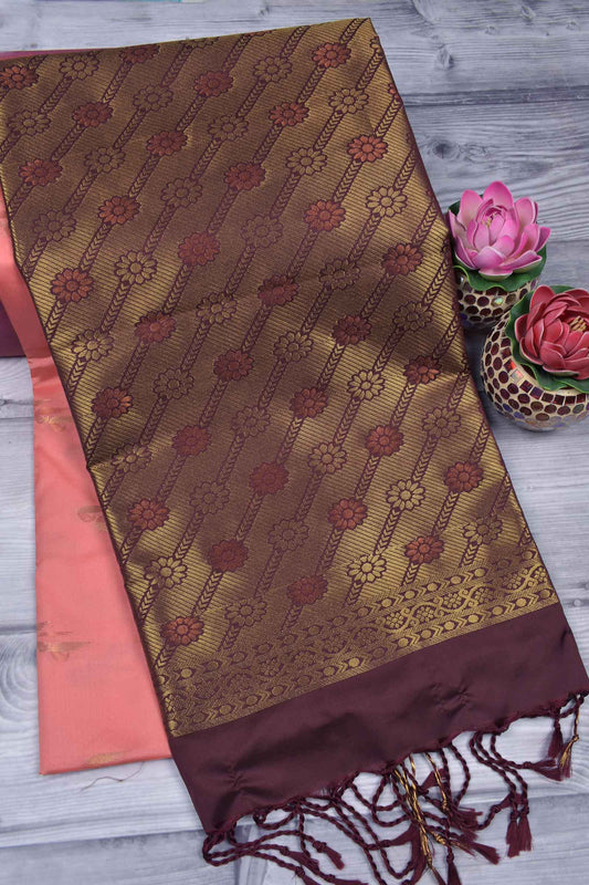 Dark Peach Fancy Butta Contrast Border Pallu Semi Soft Silk Saree