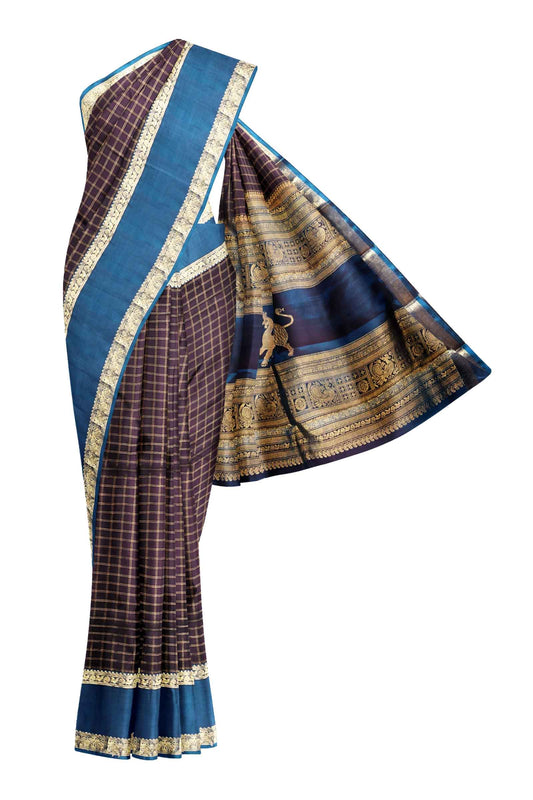 Dark Violet Light Weight Pure Silk Checkered Body Contrast Blue Border Yazhi Butta Pallu Saree