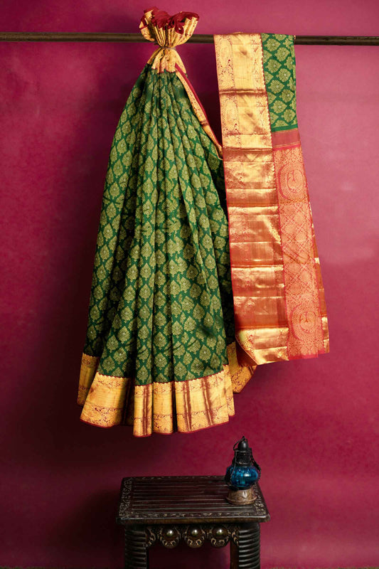 Dark Green Kanchipuram Bridal Pure Silk All Over Butta Body Pink Contrast Pallu Saree