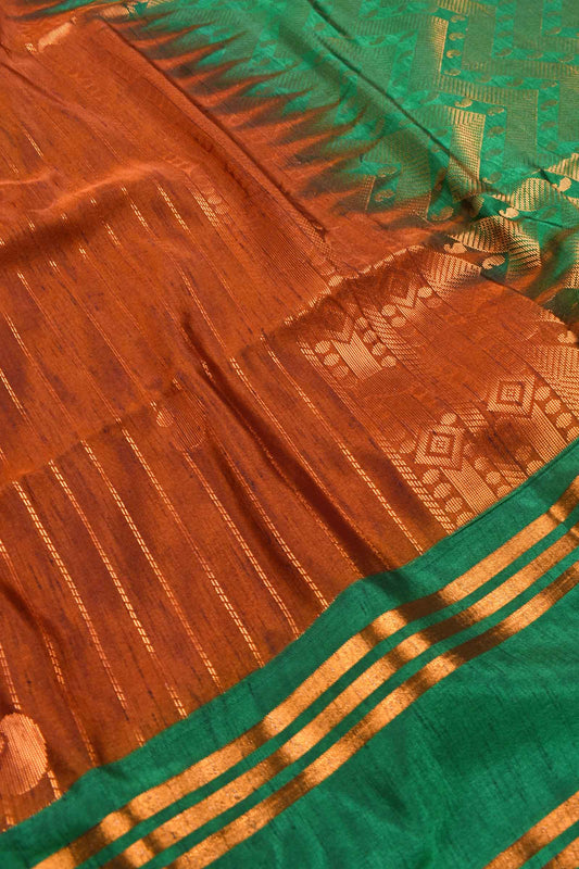 Brown Green Dupion Slub Body Butta Fancy Border Semi Soft Silk Saree