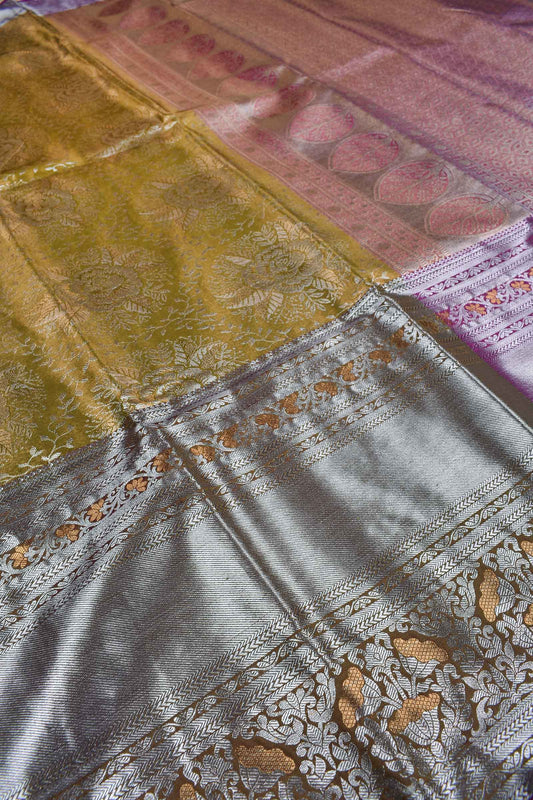 Brownish Green Semi Silk Big Chakra Butta Violet Border Tissue Saree