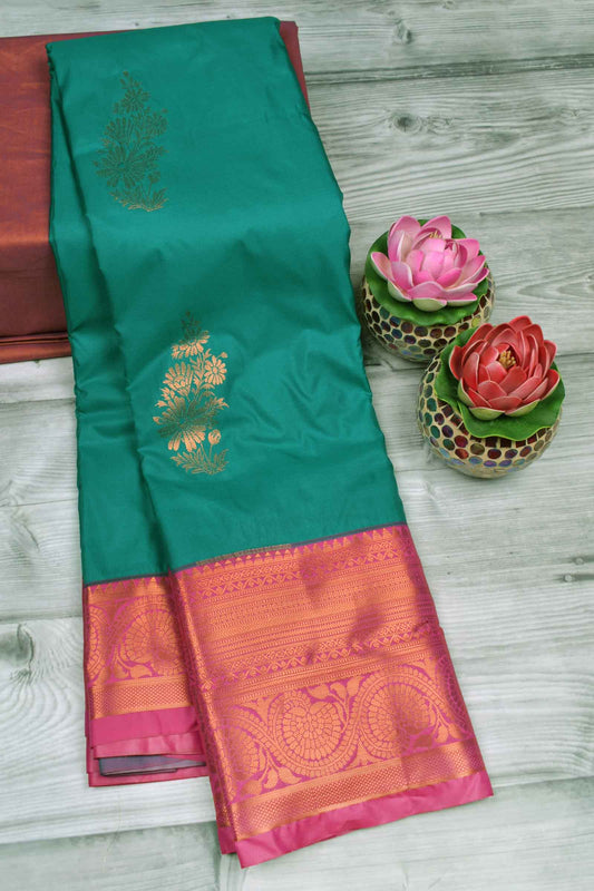 Dark Brown Body Fancy Butta Green Border Pallu Semi Soft Silk Saree