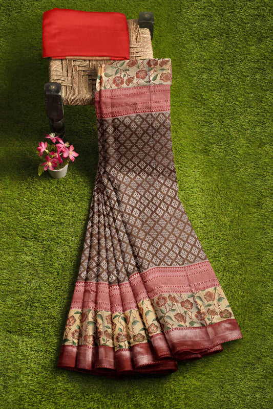 Dark Maroon Semi Silk Mini Floral Butta Zari Border Saree