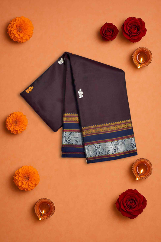 Dark Brown Light Weight Pure Silk Butta Annan Elephant Border Pallu Saree NAA148