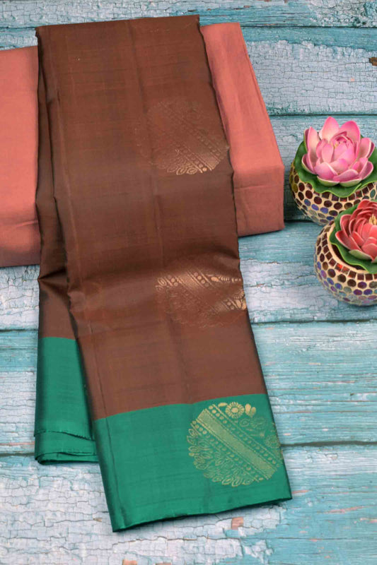 Brown Peacock Butta Chariot Border Black Zari Pallu Semi Soft Silk Saree