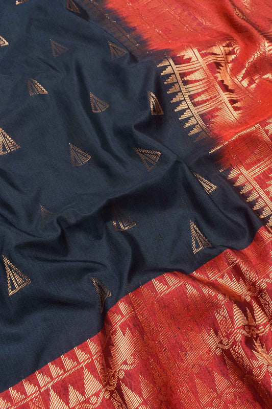 Black Red Dupion Slub Triangle Butta Fancy Border Semi Soft Silk Saree