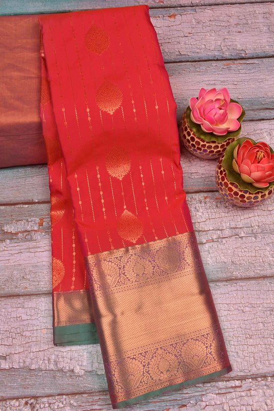 Red with Rose Semi Soft Silk Traditional Zari Lines Contrast Pallu Saree