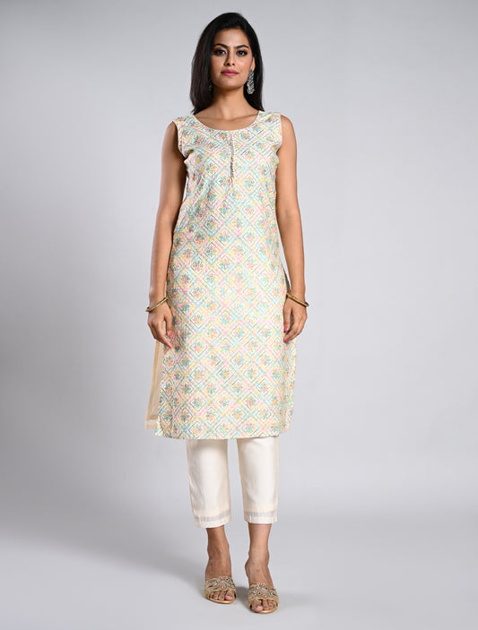Elegant White Straight Cut kurti Set with Multicolored Dupatta